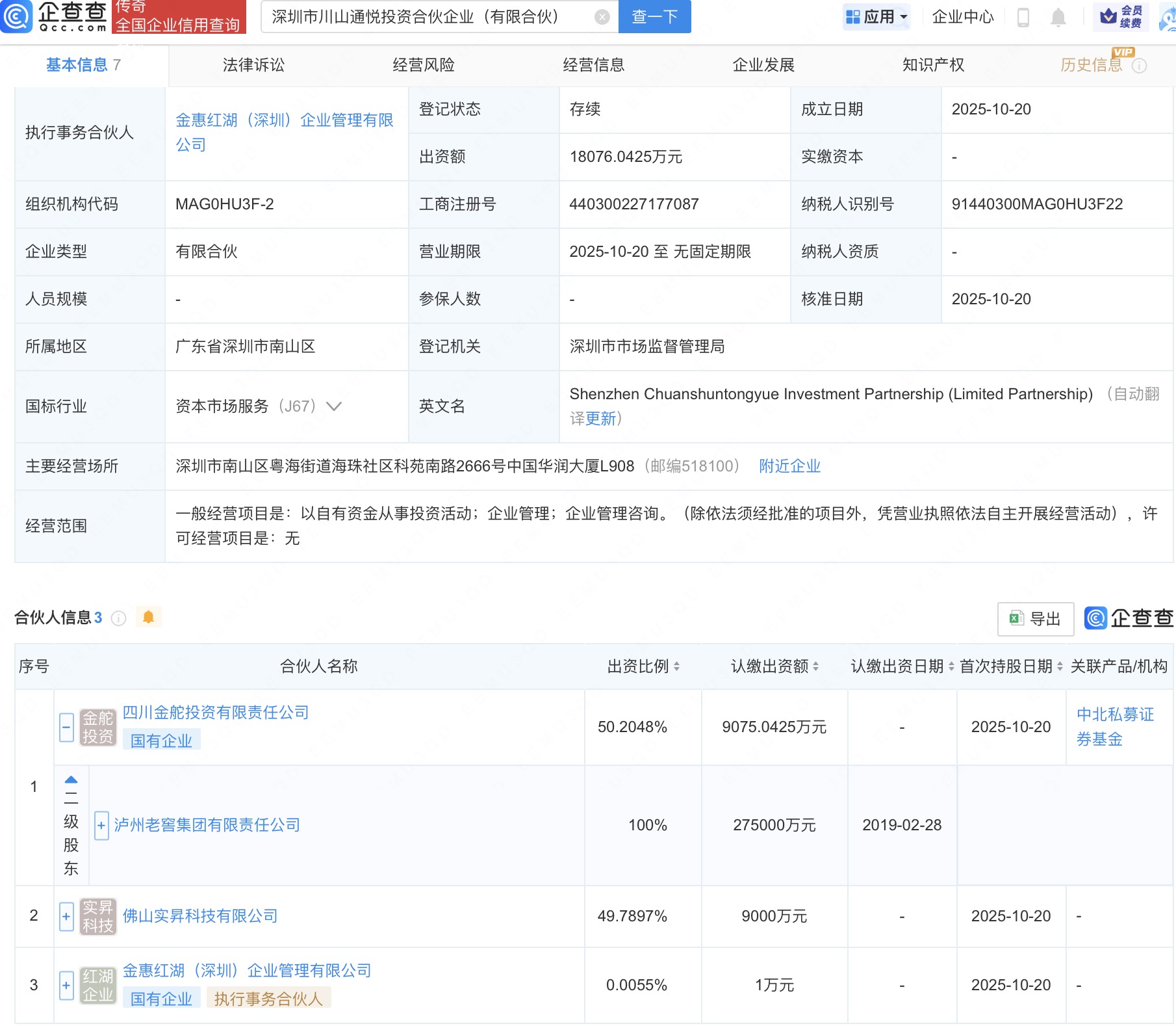 近日,深圳市川山通悦投资合伙企业(有限合伙)成立,经营范围包含:以自有资金从事投资活动;企业管理;企业管理咨询。企查查股权穿透显示,该企业由泸州老窖集团有限责任公司全资子公司四川金舵投资有限责任公司等共同出资。