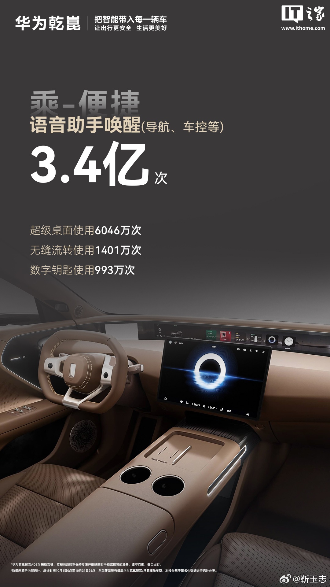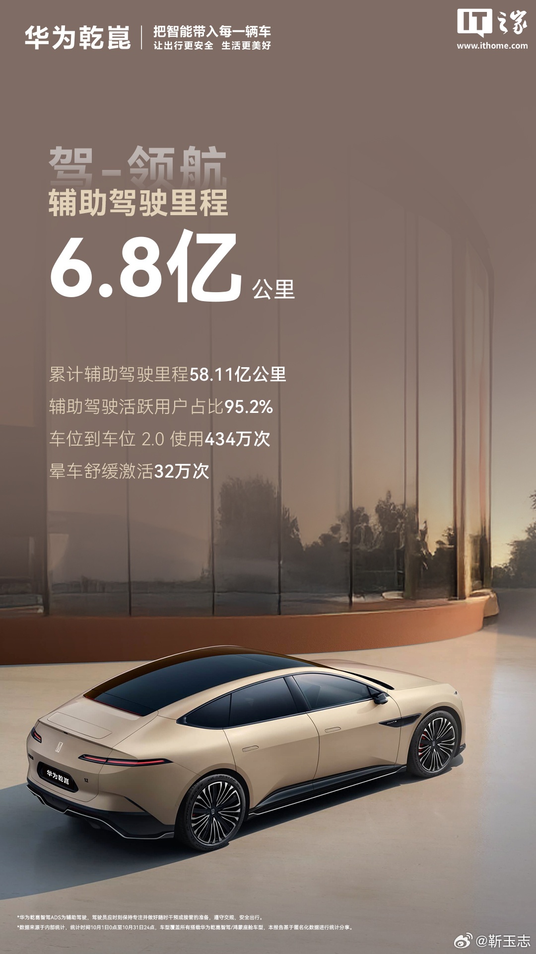 IT之家 11 月 4 日消息,华为智能汽车解决方案 BU CEO 靳玉志今日分享了华为乾崑用户的 10 月出行报告。他宣布,华为乾崑辅助驾驶里程新增 6.81 亿公里,相当于绕赤道 1.7 万圈。同时语音助手被唤醒了 3.44 亿次。