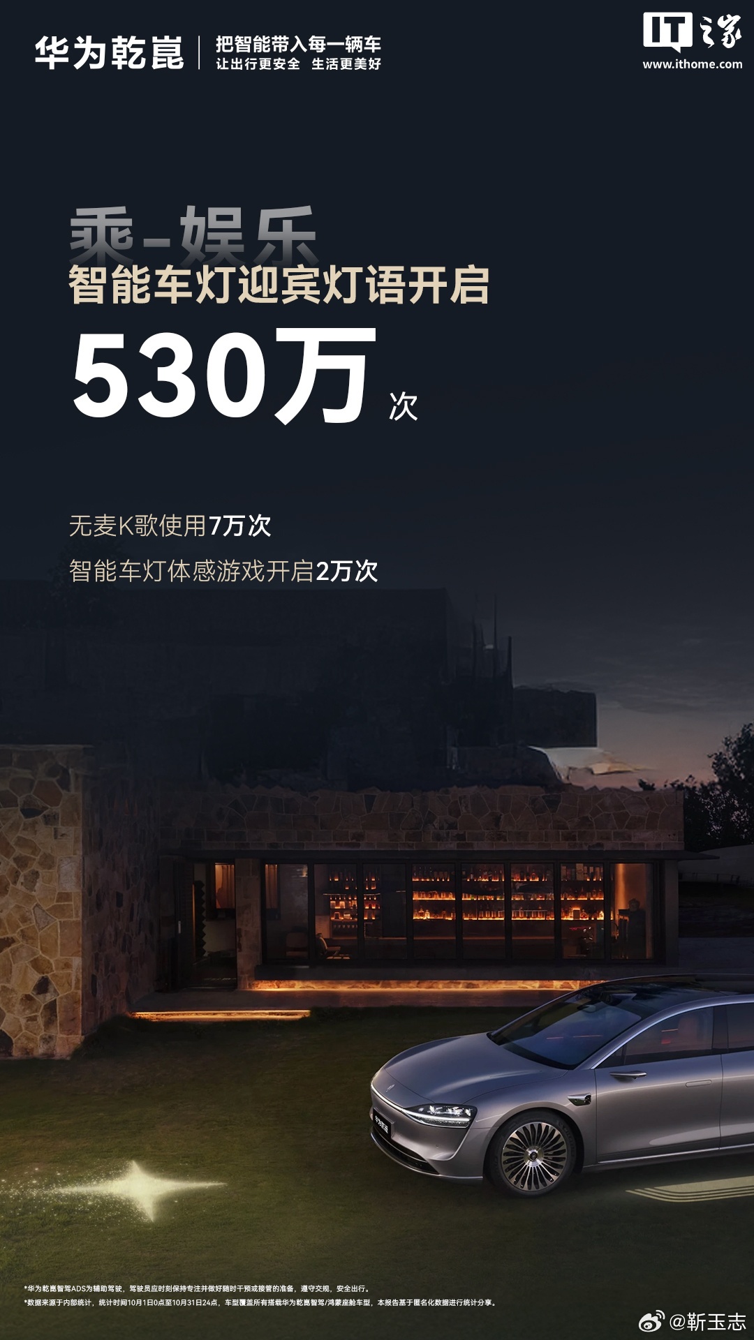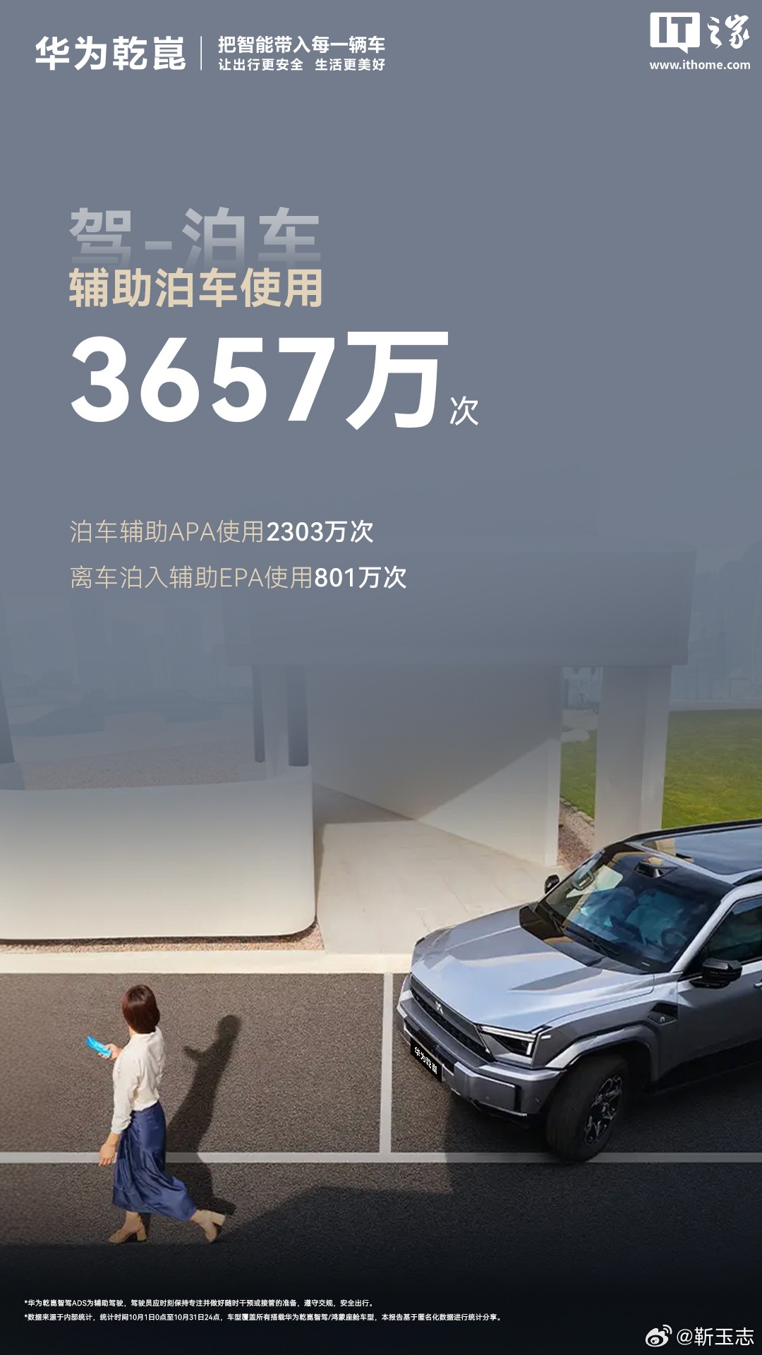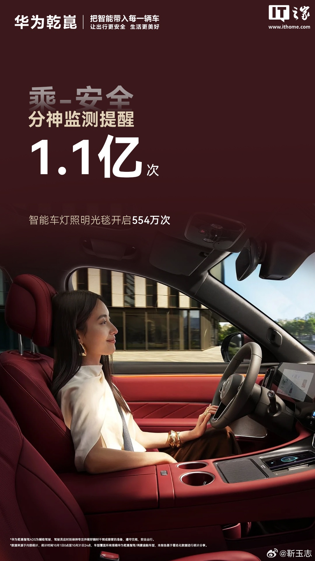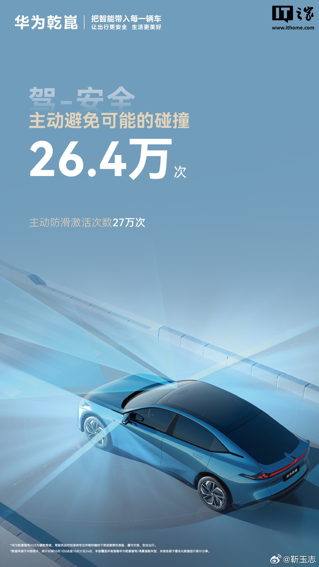 从靳玉志分享的海报来看,华为乾崑辅助驾驶系统在 10 月主动避免可能的碰撞 26.4 万次、分神监测提醒 1.1 亿次、泊车辅助使用 3657 万次。