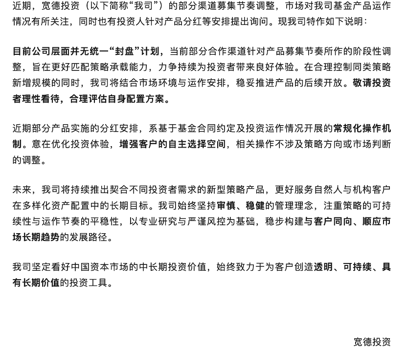 公司强调,“目前公司层面并无统一‘封盘’计划”,当前部分合作渠道针对产品募集节奏所做的“阶段性调整”,其根本目的在于“更好地匹配策略承载能力”,目标是“力争持续为投资者带来良好体验”。声明同时解释了近期部分产品分红属于基金合同约定的常规操作,意在优化投资体验,增强客户自主选择权,无关策略方向或市场判断的调整。
